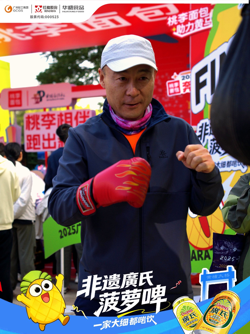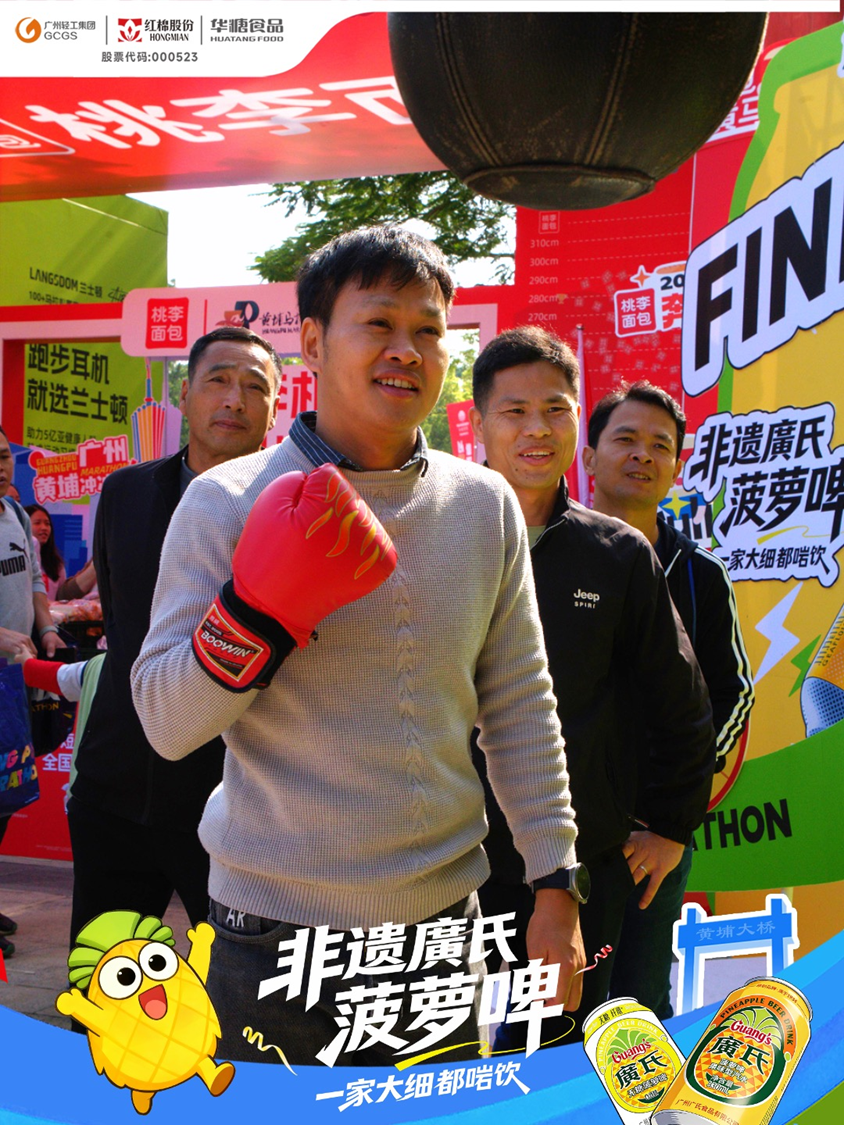 当日,廣氏沁爽能量站成为了跑者与市民共同驻足的打卡地标。拳击挑战机前,挑战者们轮番挥拳,向自我力量的极限发起冲击。这并非简单的游戏互动,而是一场由廣氏助推的力量对话——拳击与奔跑,虽形式各异,却诠释着同一种精神:挑战自我,永不止步。而当一罐冰爽的非遗廣氏菠萝啤触碰到跑者温热的掌心,这份沁爽便超越了饮料本身,成为与跑者同频共振的陪伴,读懂拼搏后的疲惫,也为每一份坚持真诚喝彩。